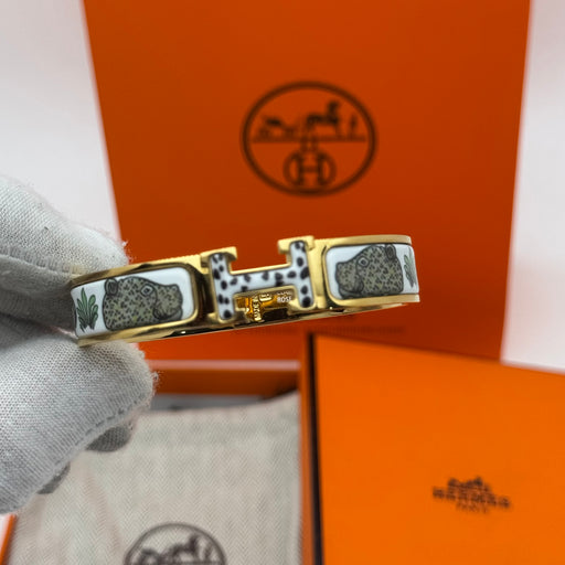 Hermès Clic H Bracelet (Slim model) Enamel artwork featuring a leopard/panther pattern Gold-tone metal finish Iconic swivel H clasp closure...