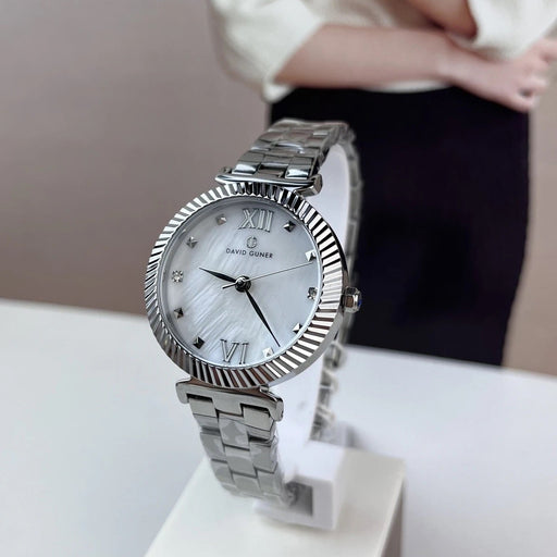 View full detailsDavid Guner Women's Silver Watch – Mother-of-Pearl Dial with Crystal Bezel